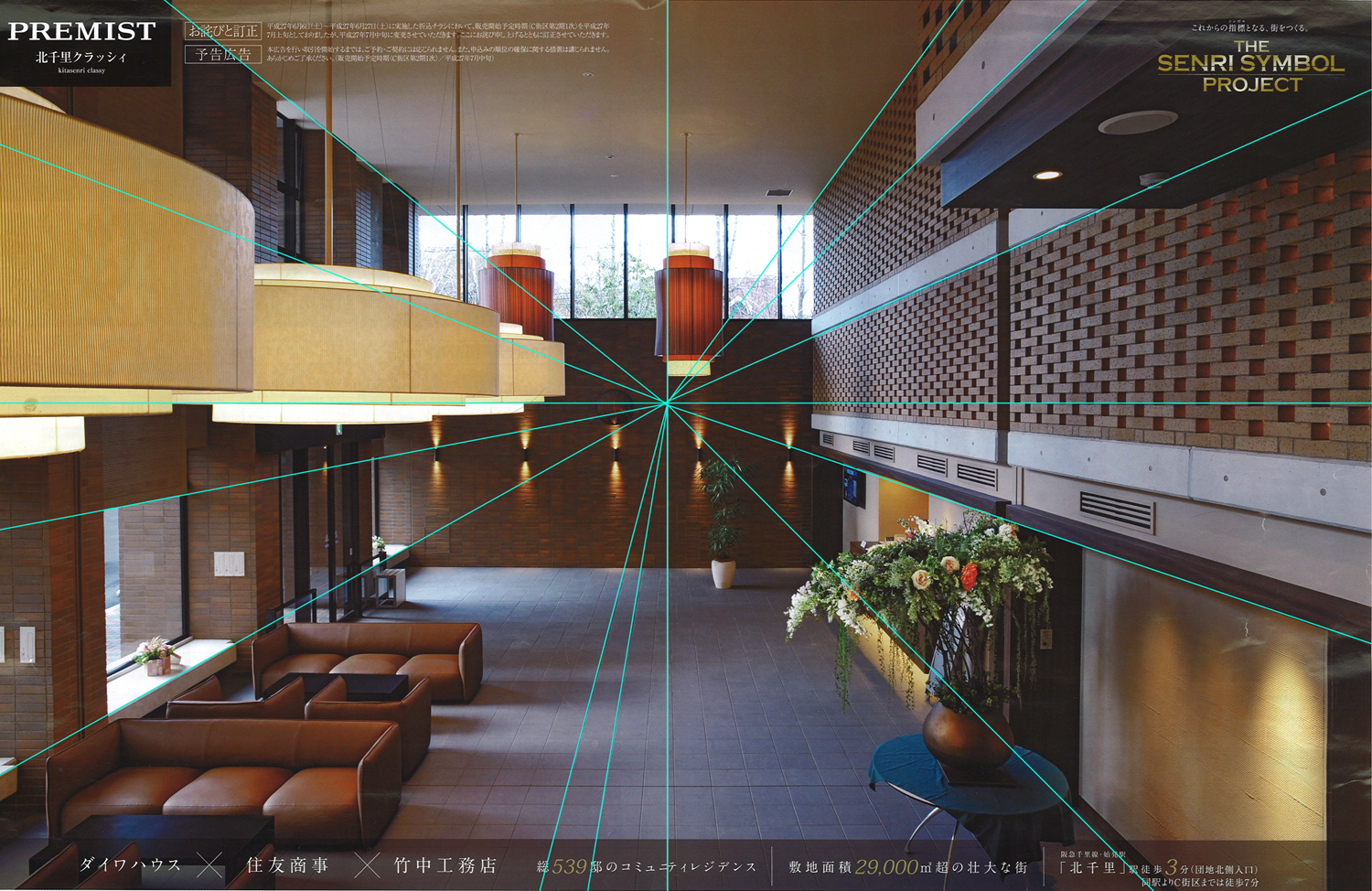 今回のマンションの写真はチラシからパソコンにスキャンしてもらったものなので、解像度はなかなか良いですが、モデリングの作業に無駄な時間をかけないためにも、消失点と水平線があったほうが作業が順調に進みます。