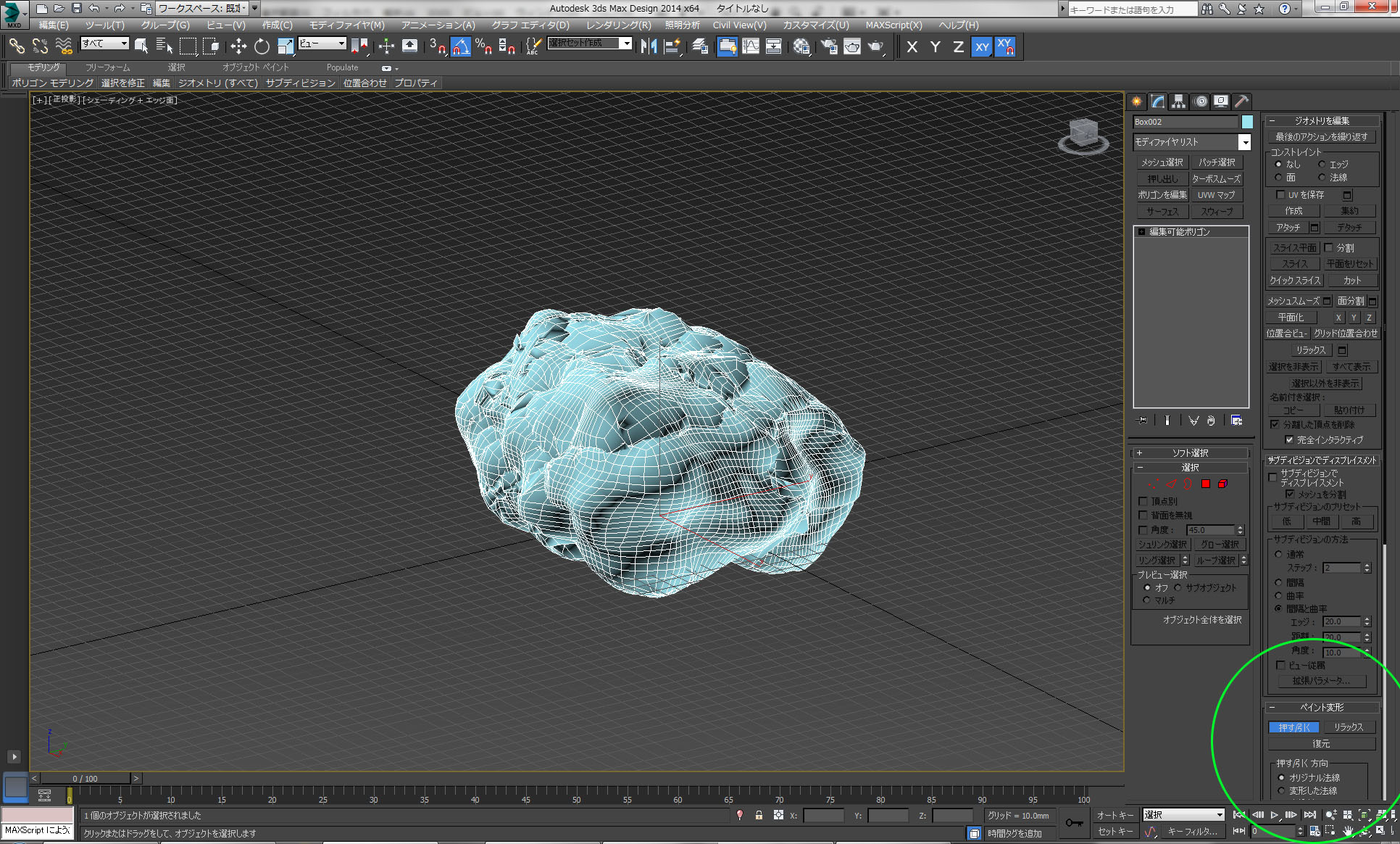 次は右側のパラメータのペイント変形のところで、押し/引くのボタンを押し、