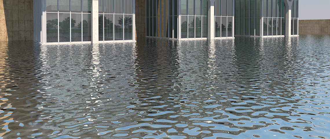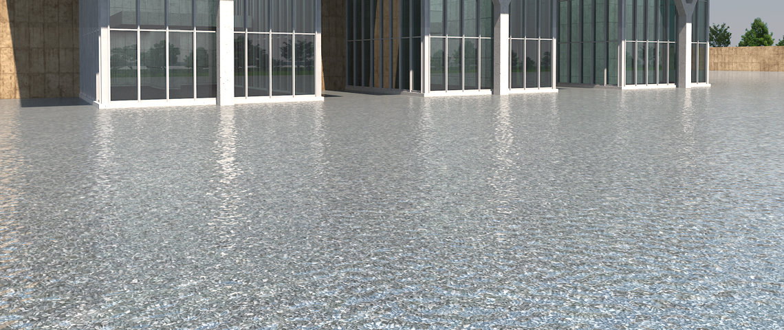 水の質感といっても、例えばコップの中の水のように、とにかく透明度はありつつ、屈折率を調整するといった場合もあれば、川や流れるプールの様に水の流れに指向性を持たせる場合など、用途や周りの環境や状況によって色々なCGパースでの表現が出来ます。