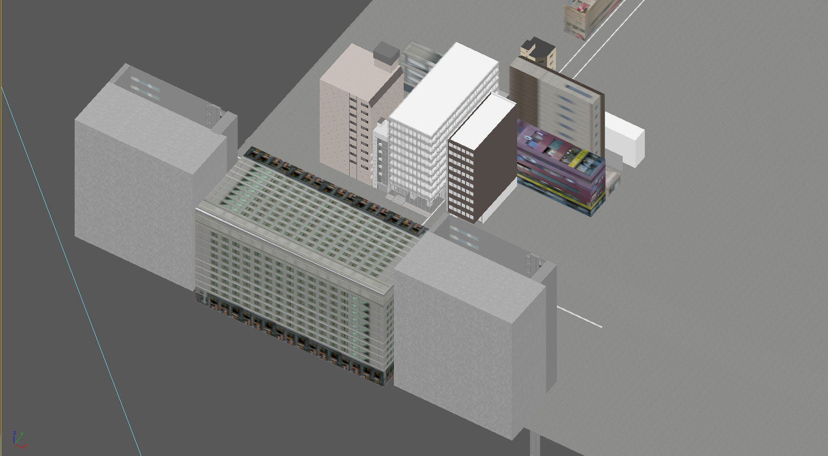 といっても、ガラスの表現をする為に入れるものなので、リアルに建てる必要は無く、過去に作った物件から適当にビルを引っ張ってきて、置いておきます。