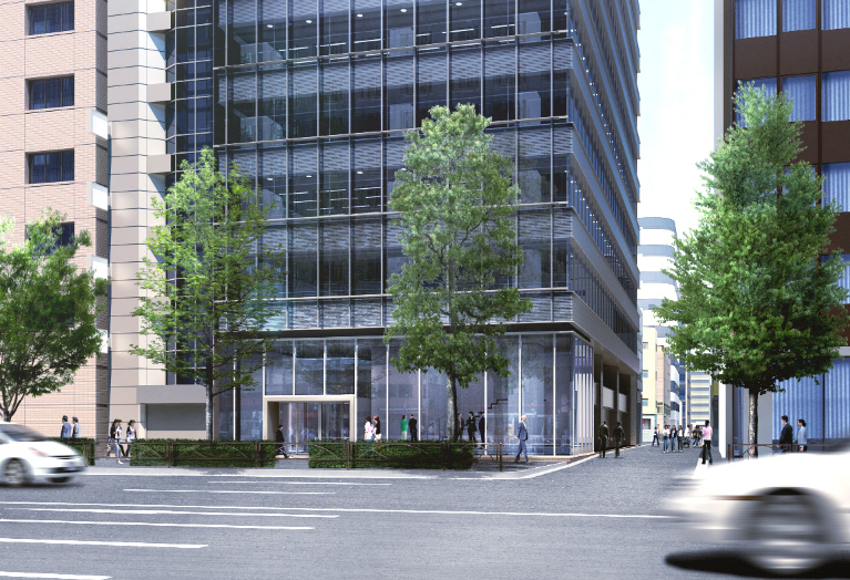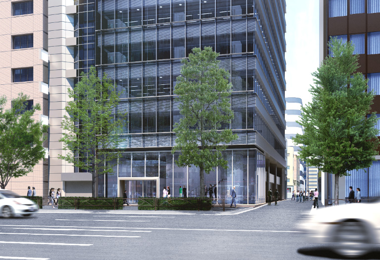 最上階から3フロア分は空を写りこませて、すっきりと見せつつ、下の階でビルなどを写りこませる事で賑やかさを出しました。
