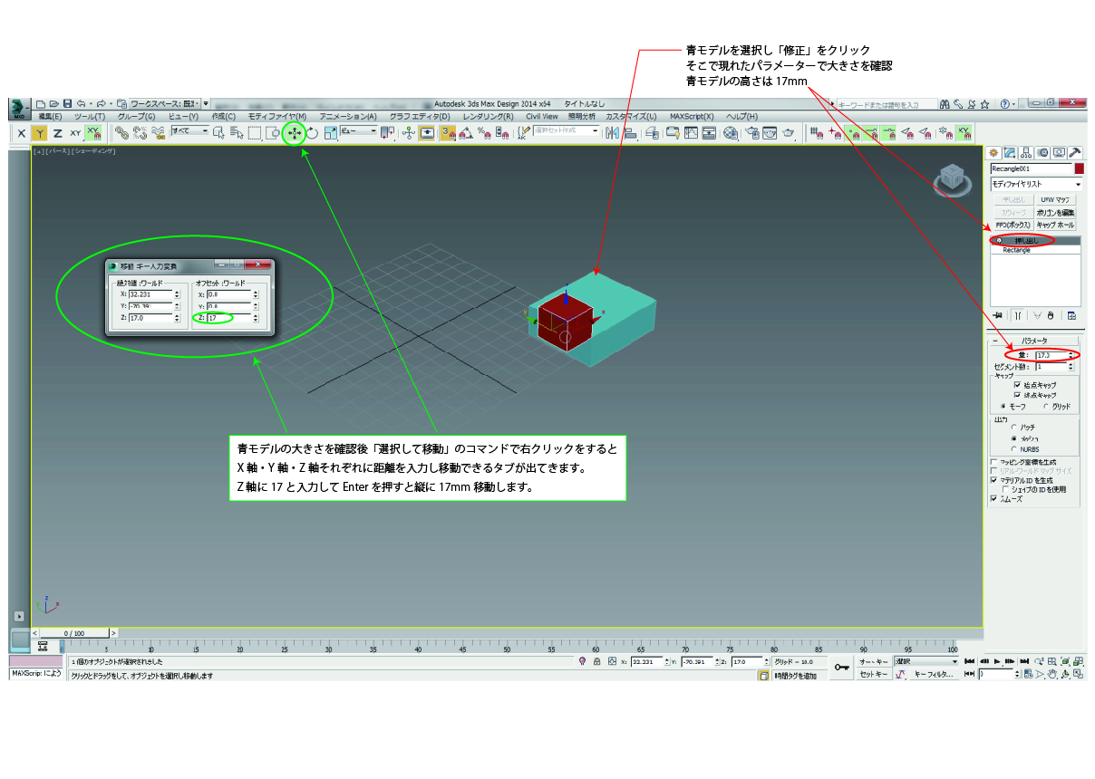 次はZ軸に移動させて青モデルの上端にもっていこうと思いますが別のやり方を使用します。
