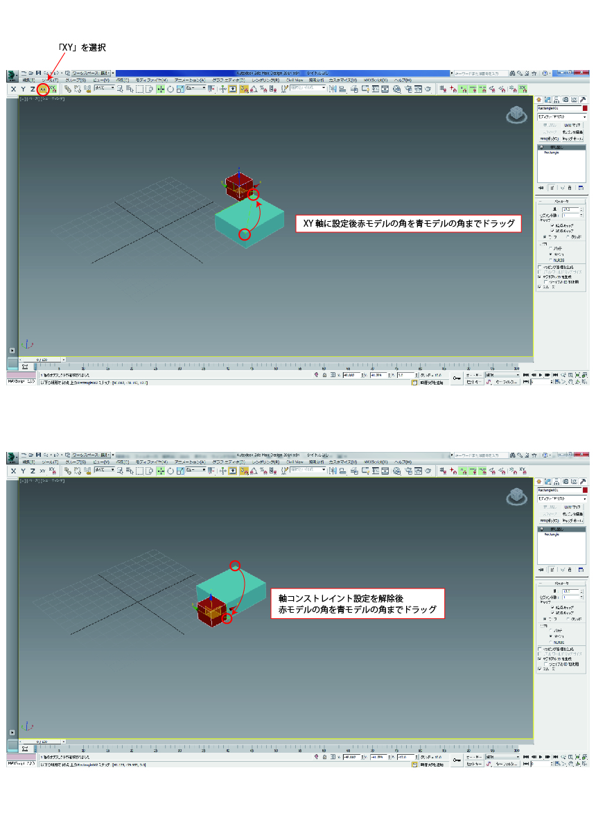 赤モデルをもう一度手前の角と下面を合わせる位置に移動させます。