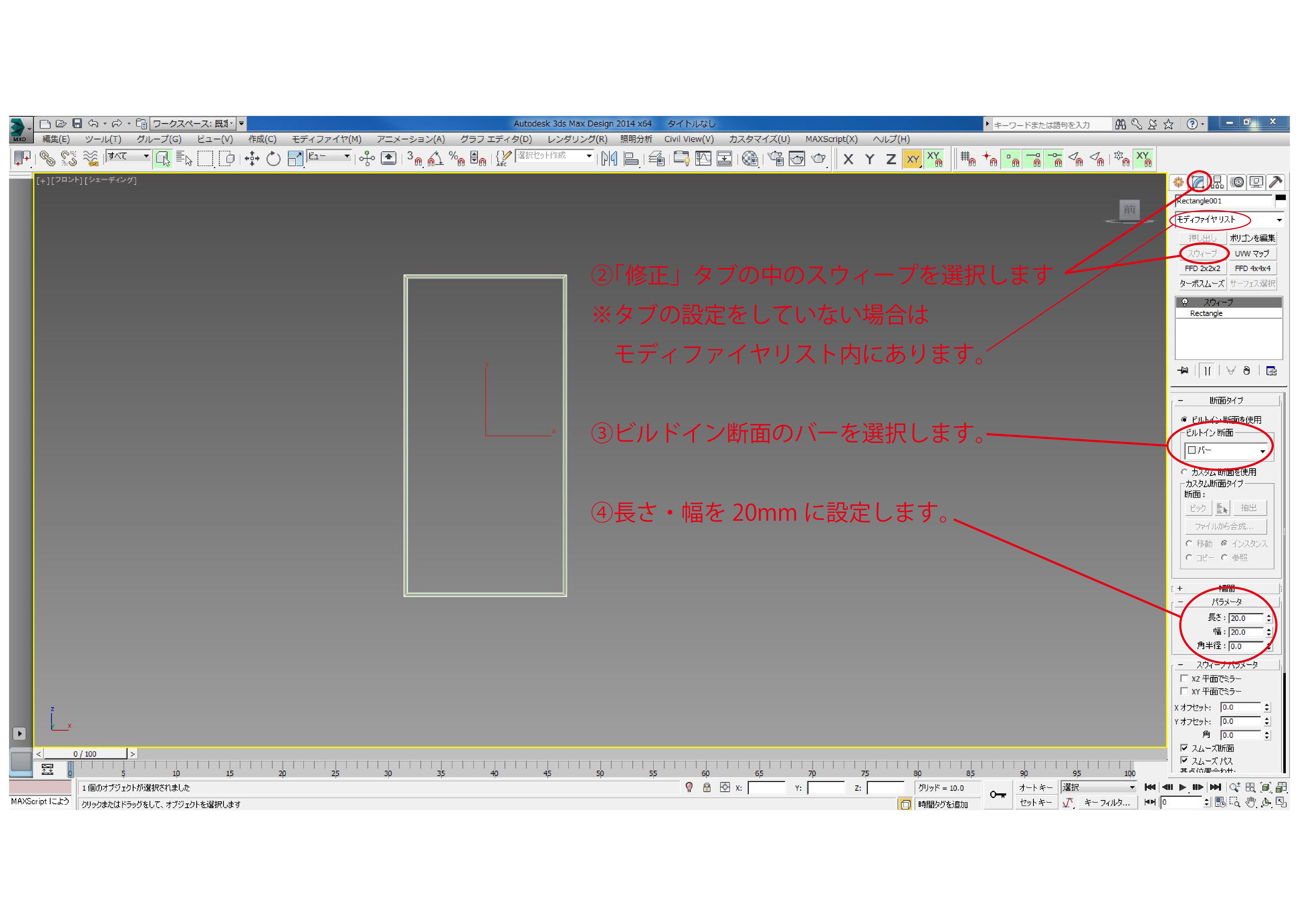 上記の作業を行うと①のラインに沿って20mm角のバーが作成されます。