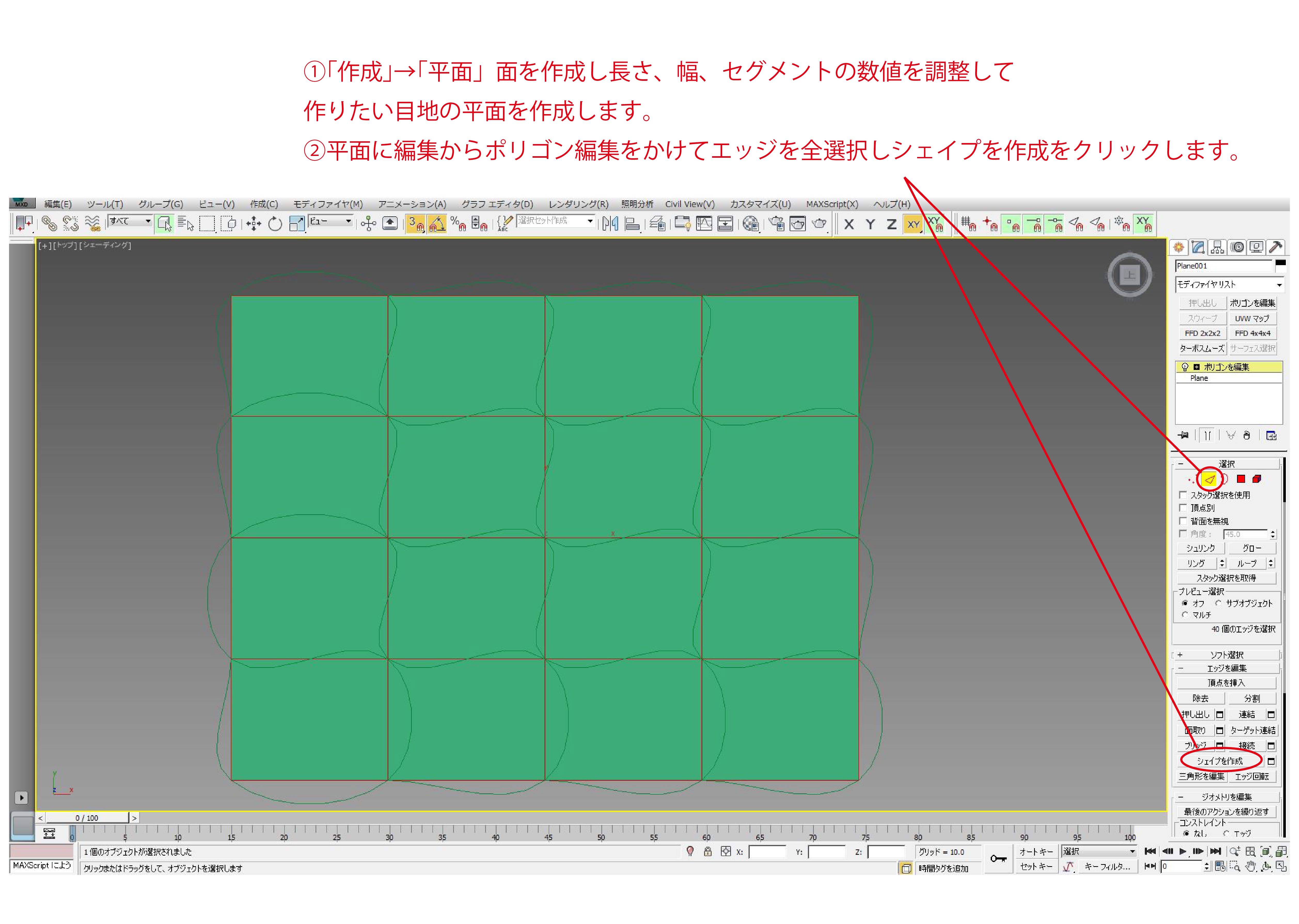 ②平面に編集からポリゴン編集をかけてエッジを全選択しシェイプを作成をクリックします。