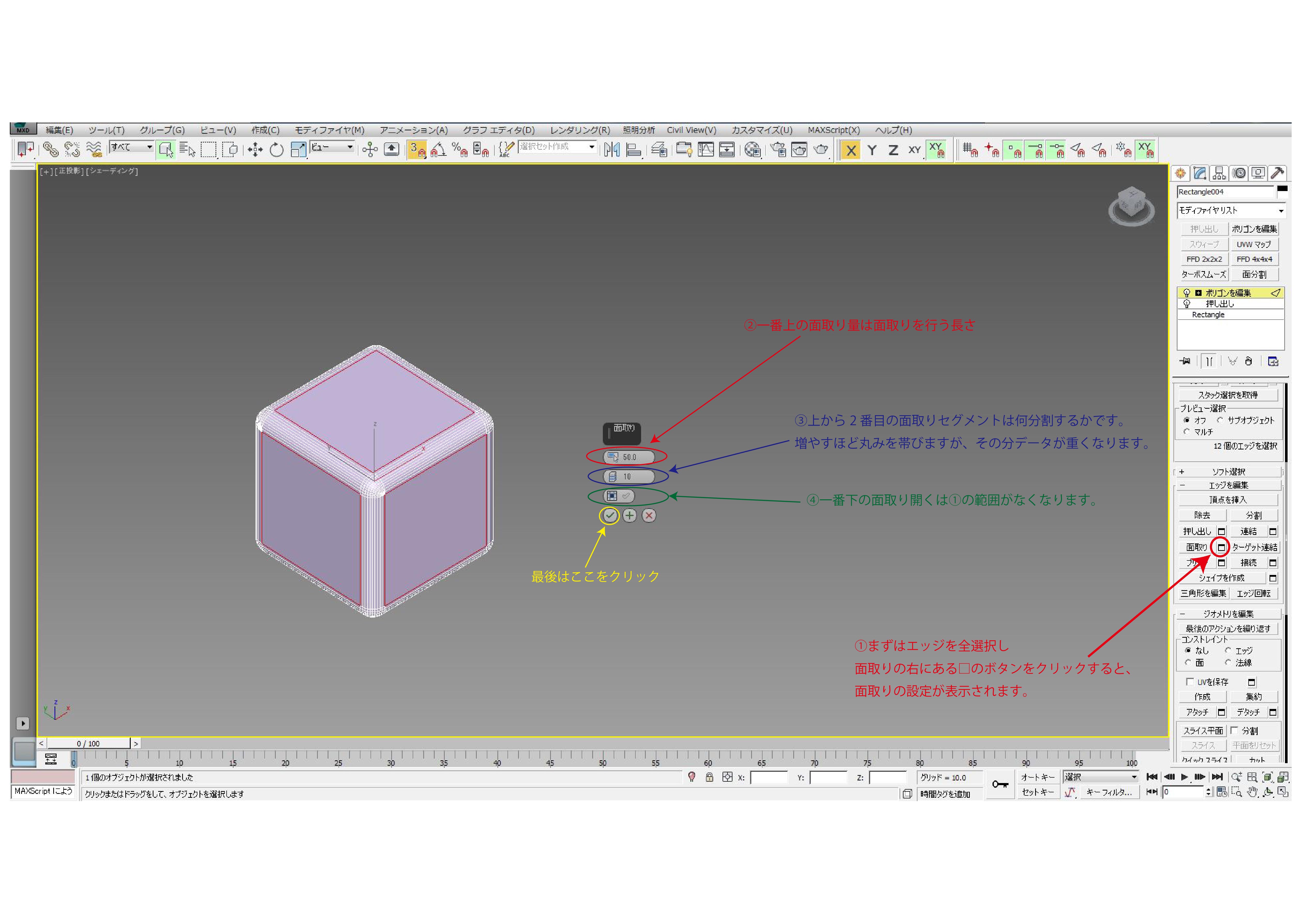 ①まずはエッジを全選択し面取りの右にある□のボタンをクリックすると、