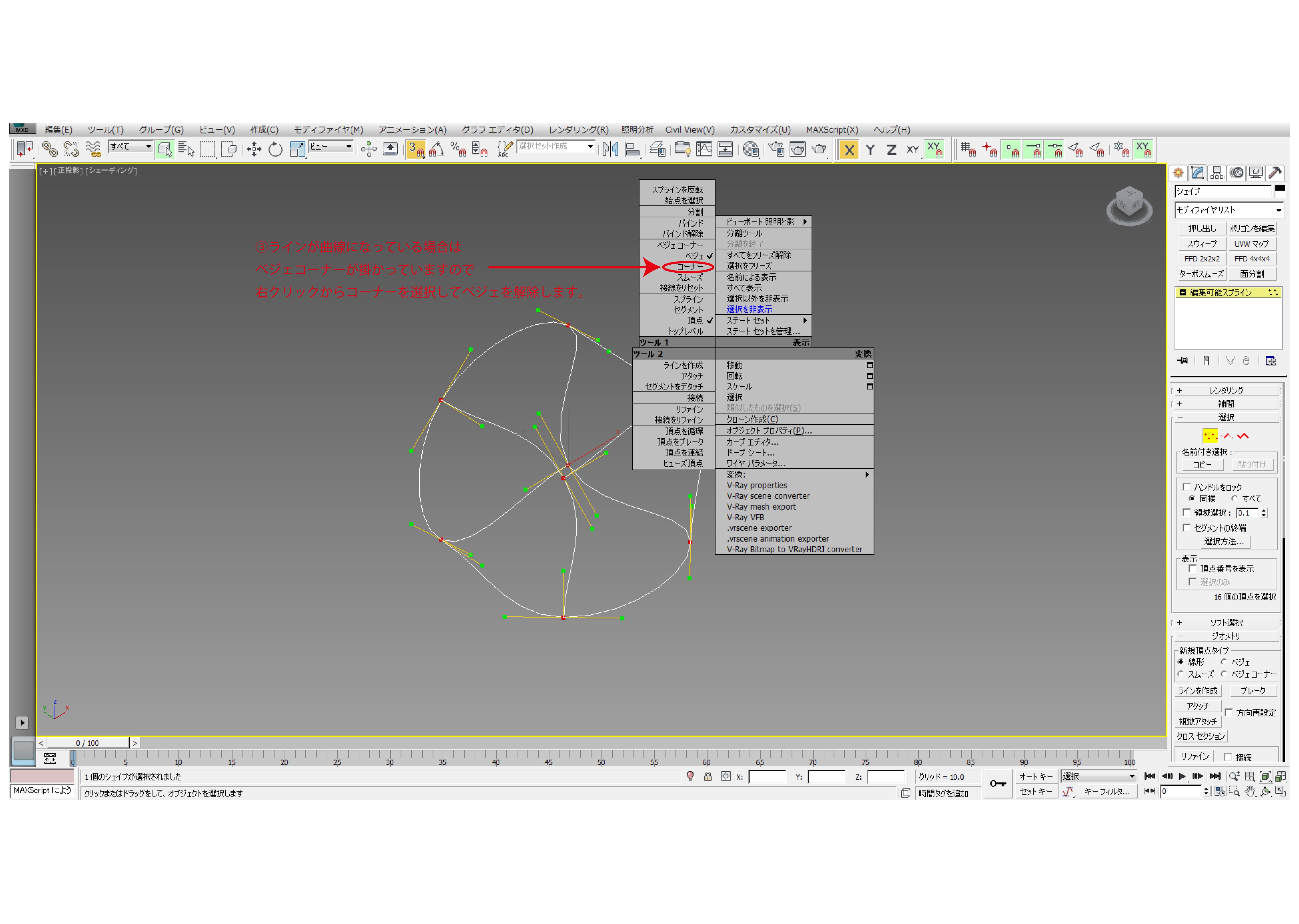 右クリックからコーナーを選択してベジェを解除します。