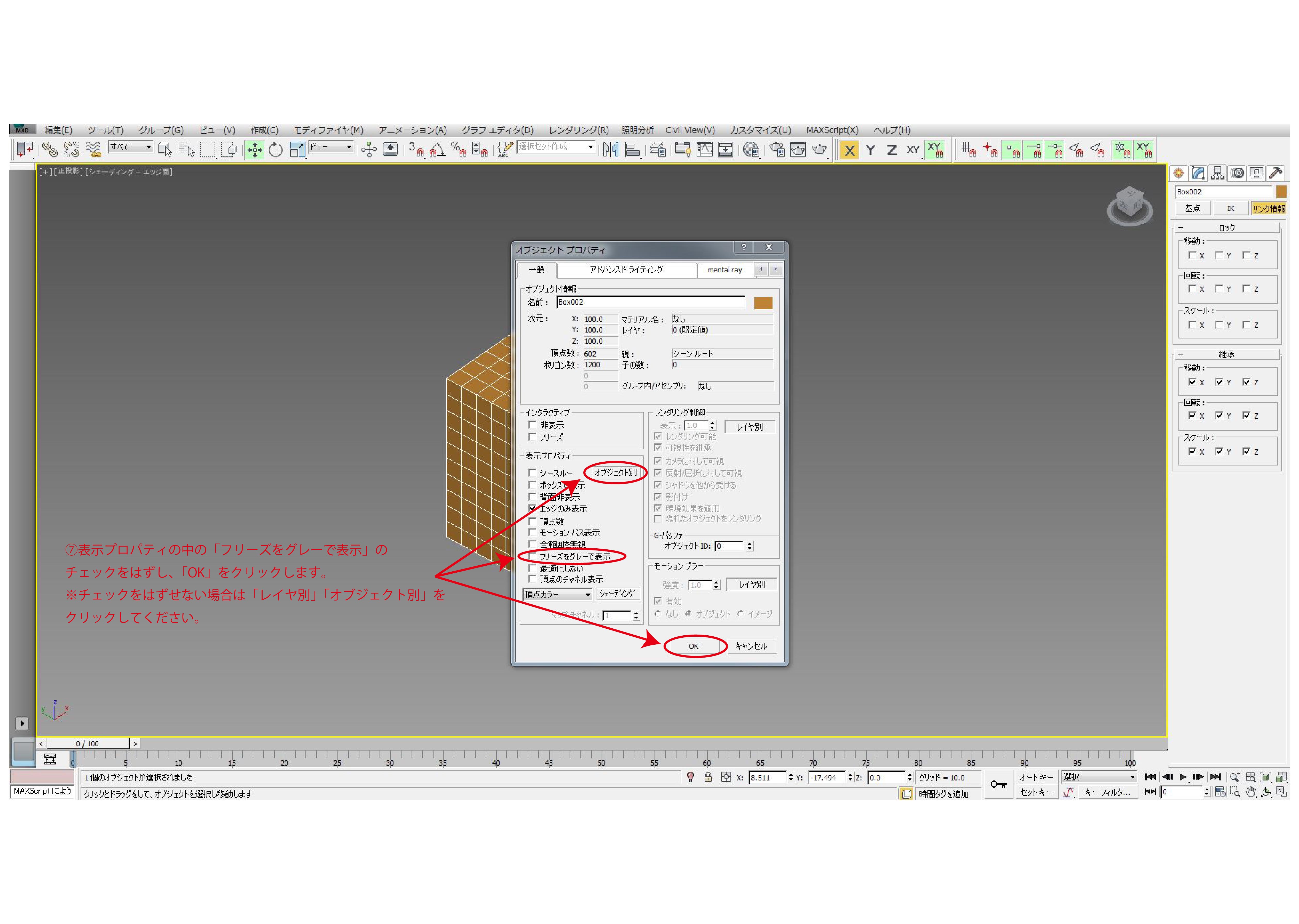 ⑥フリーズするモデルを選択し、右クリックからオブジェクトプロパティをクリックします。