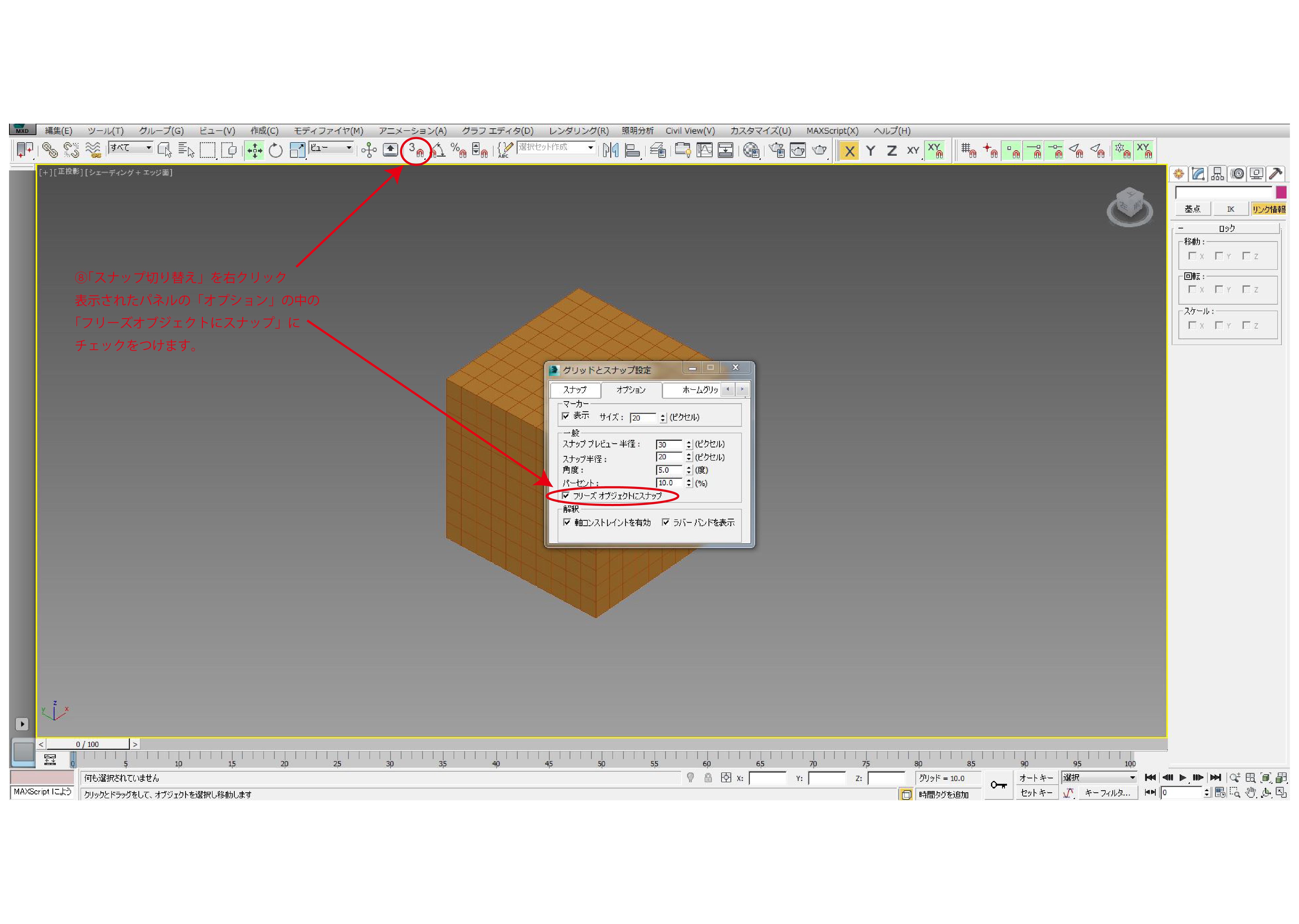 表示されたパネルの「オプション」の中の「フリーズオブジェクトにスナップ」に