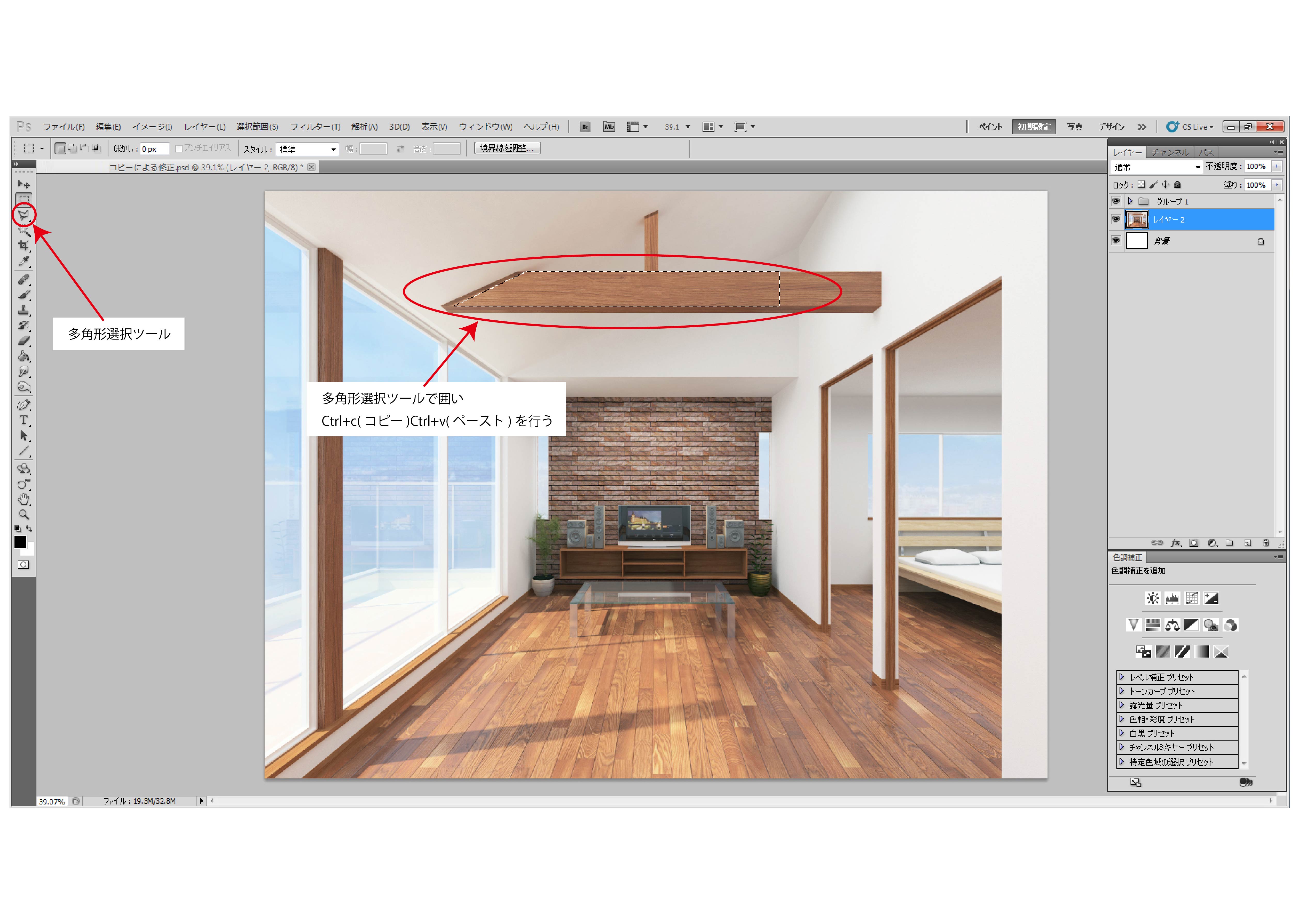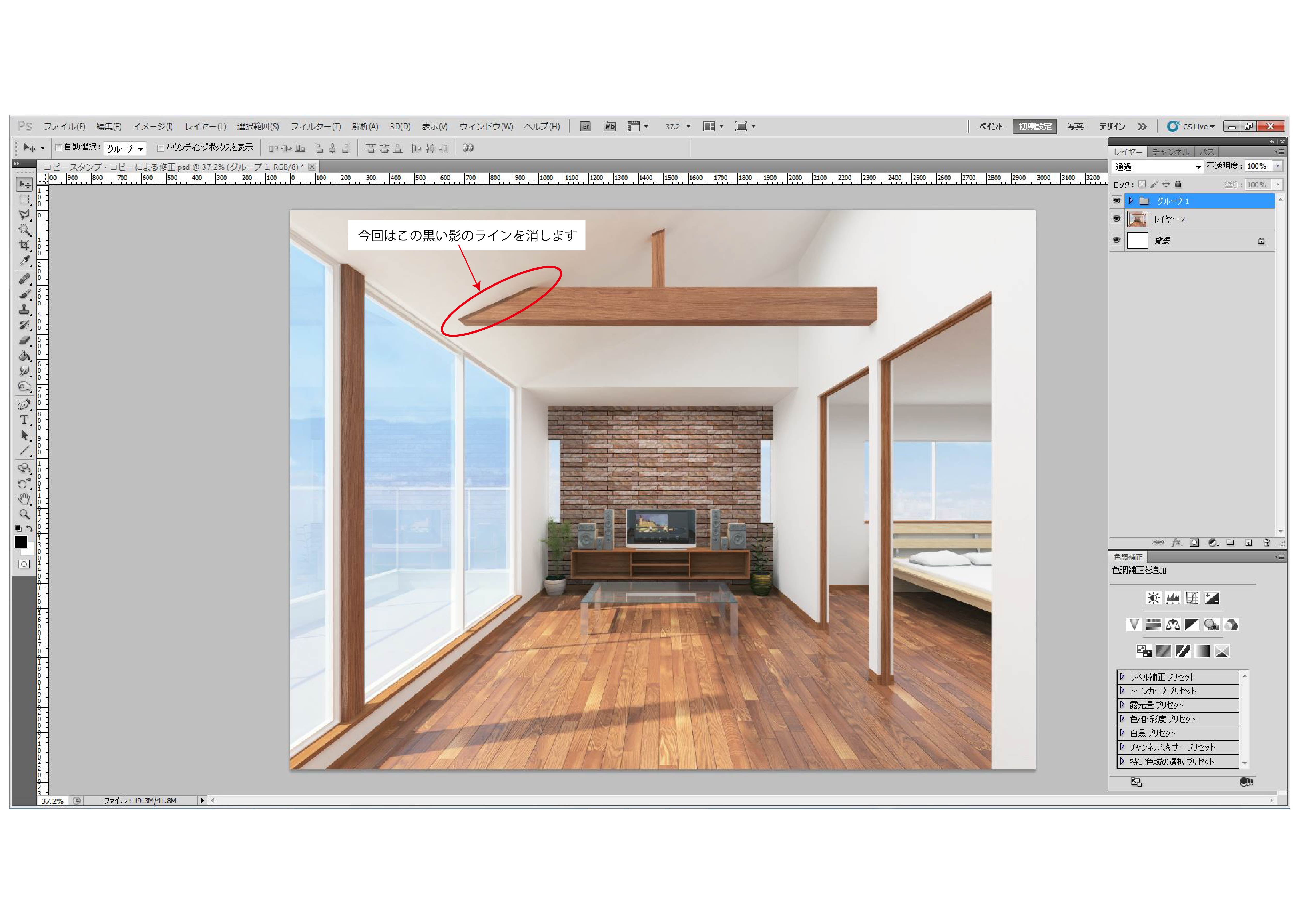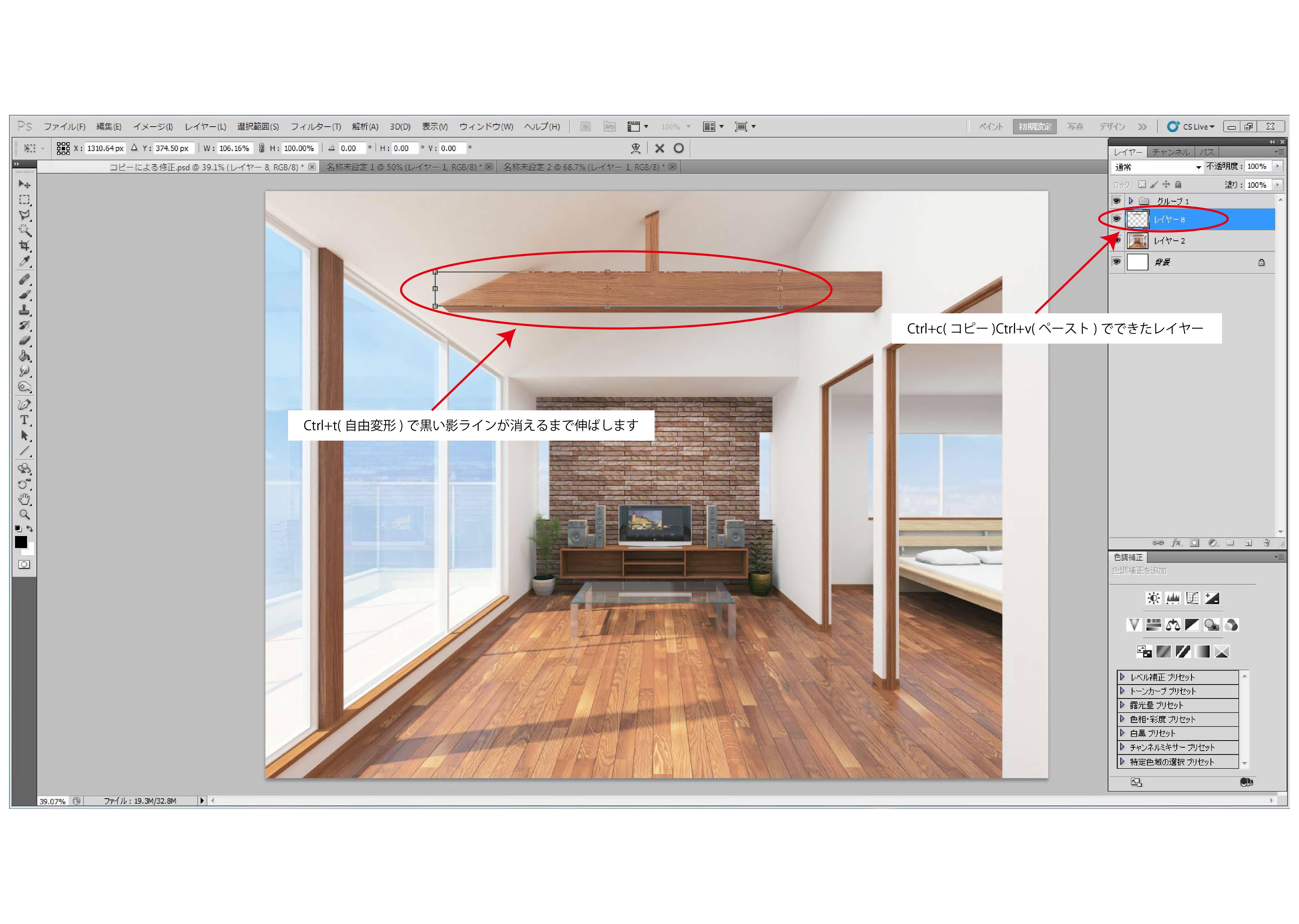 ベストは化粧梁の木で消す方法ですので、まずはそちらの修正を行いながらご説明致します。