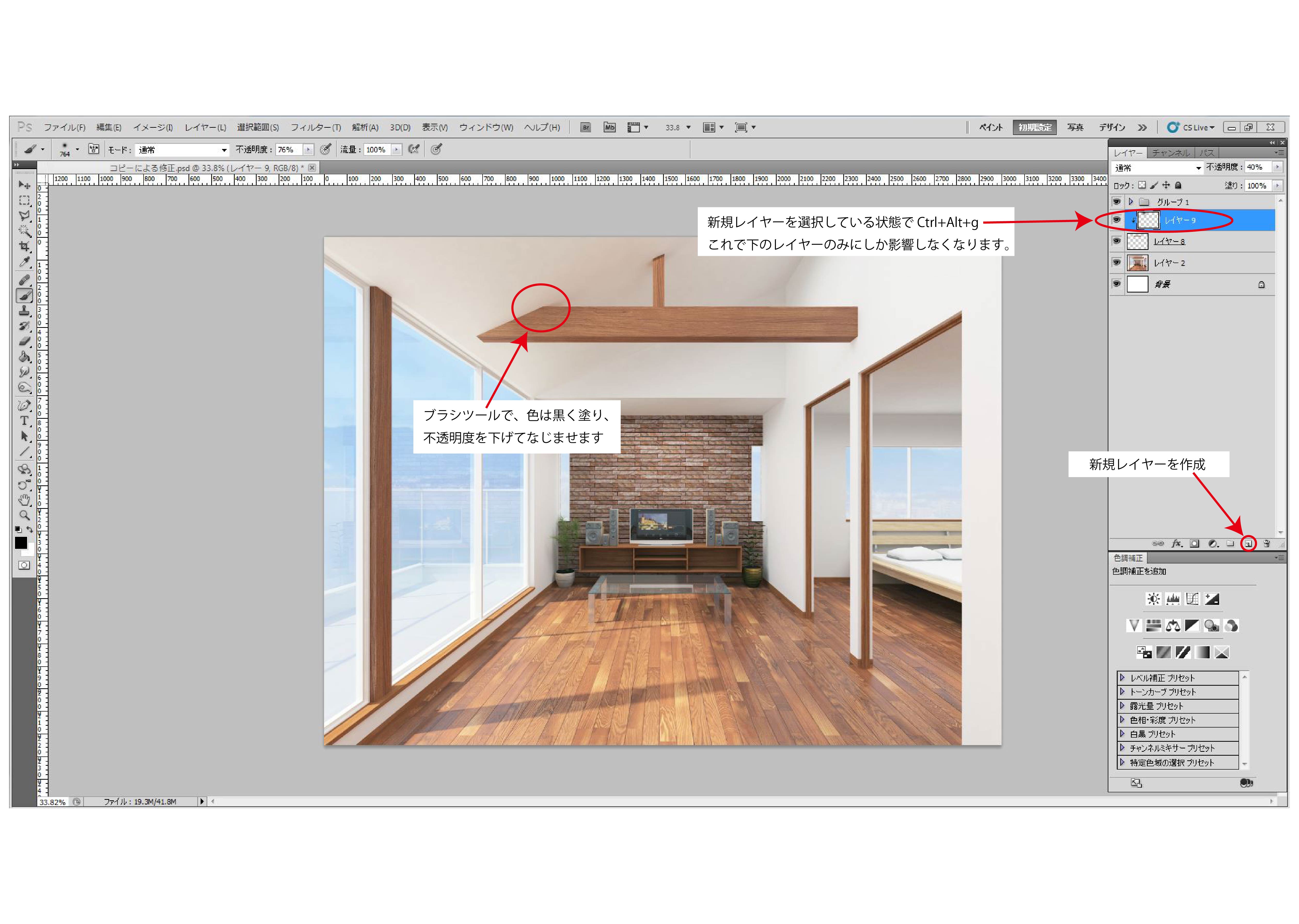 まずはコピーした木梁レイヤーの上に新規レイヤーを作成します。