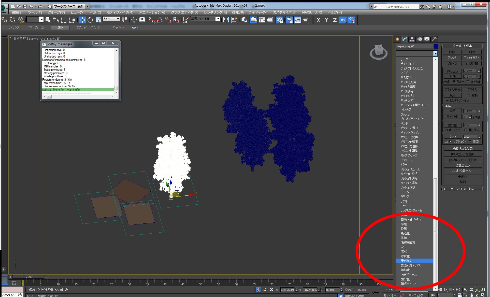 まず、ポリゴンの多いオブジェクトとポリゴンの少ないオブジェクトを用意します。位置を確定したら、オブジェクトを選択し、「置き換え」モディファイヤを適用します。