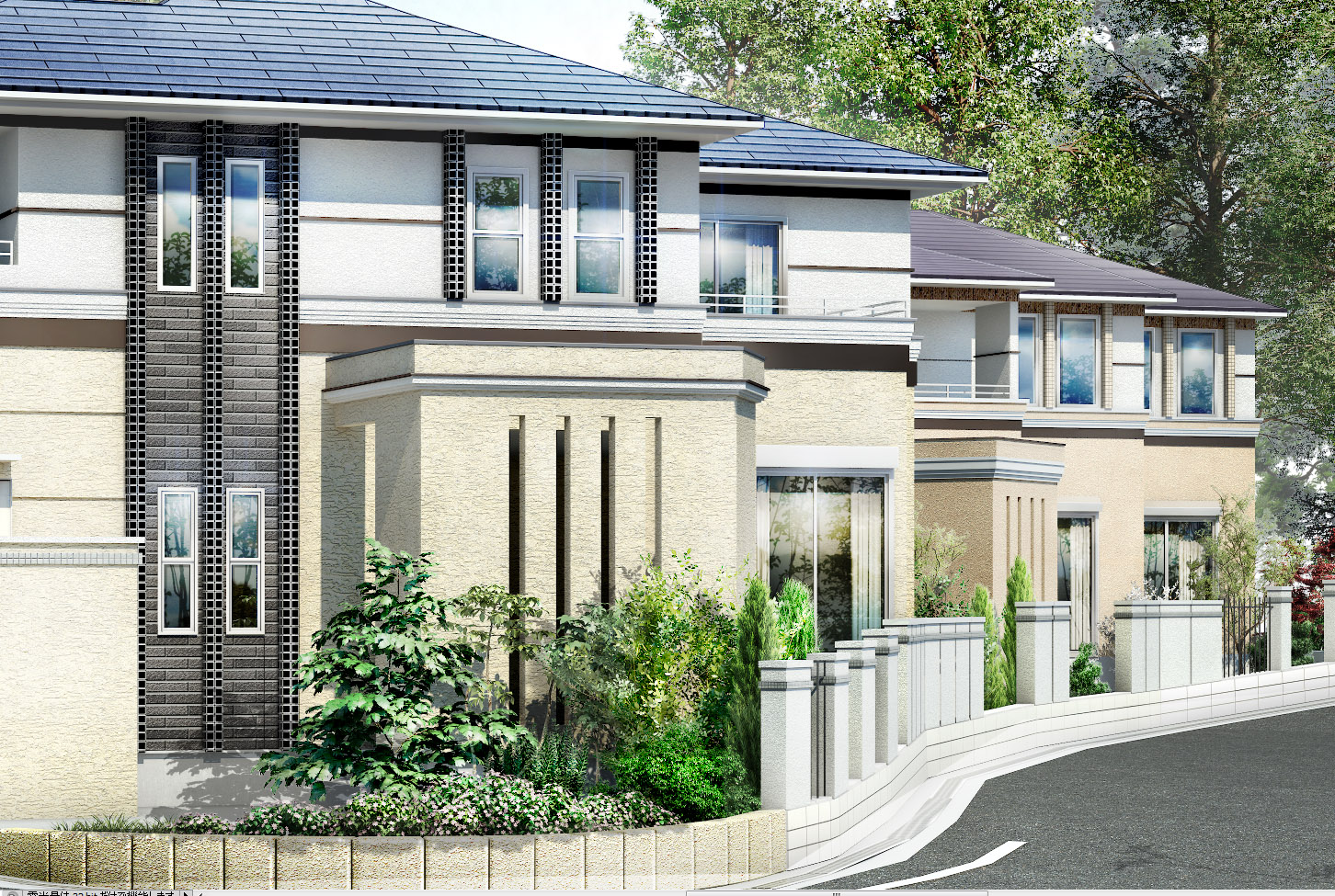 今回は、一戸建て(ハピアガーデン千里古江台)の実物の写真を見本にして、CGパースを作ってみたいと思います。前添景の部分はずっと2Dで加えましたが、今回は新たな試しをしてみたいため、添景の植物は全部3Dの素材で入れました。
