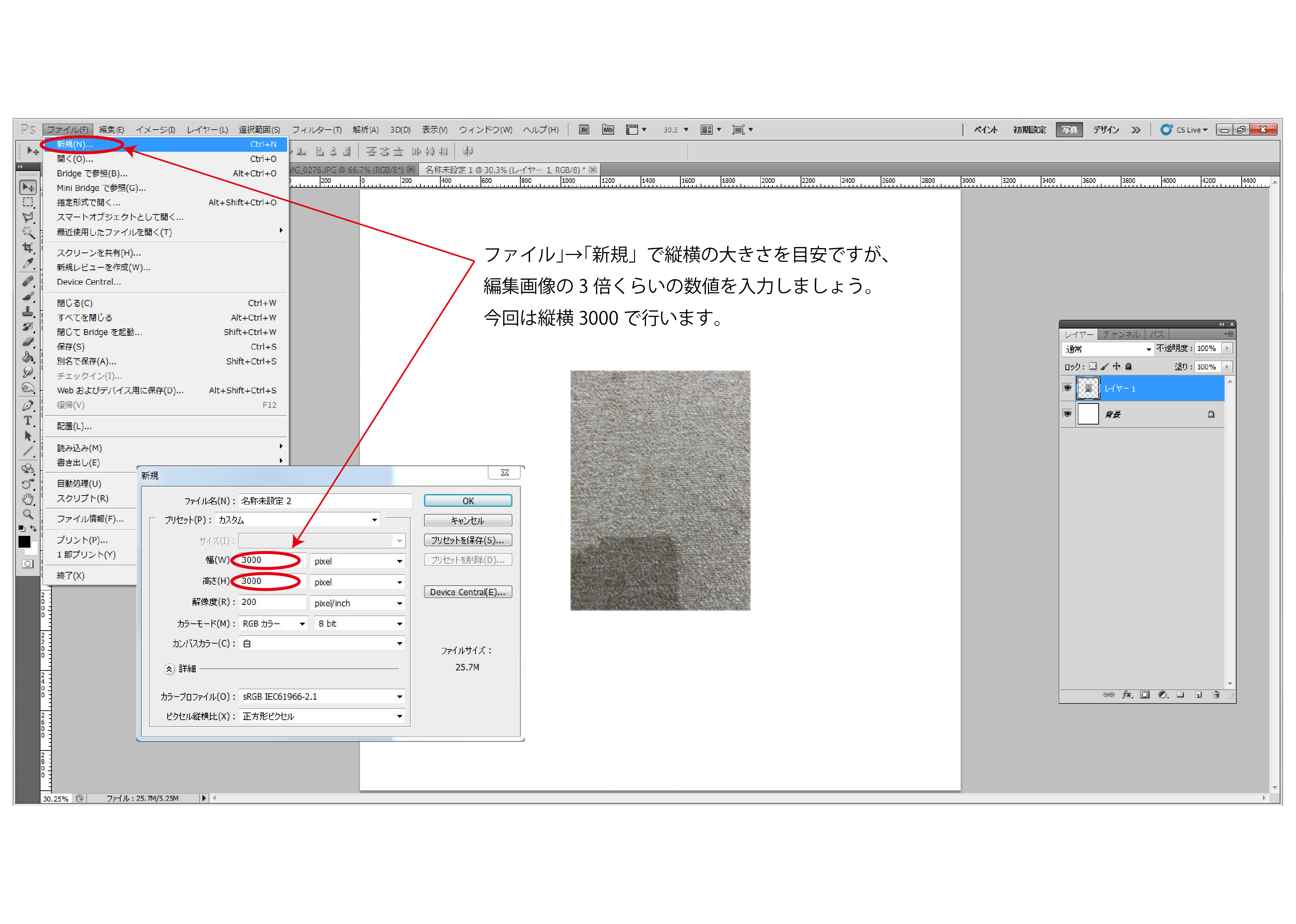 「ファイル」→「新規」で縦横の大きさを目安ですが、編集画像の3倍くらいの数値を入力しましょう。
