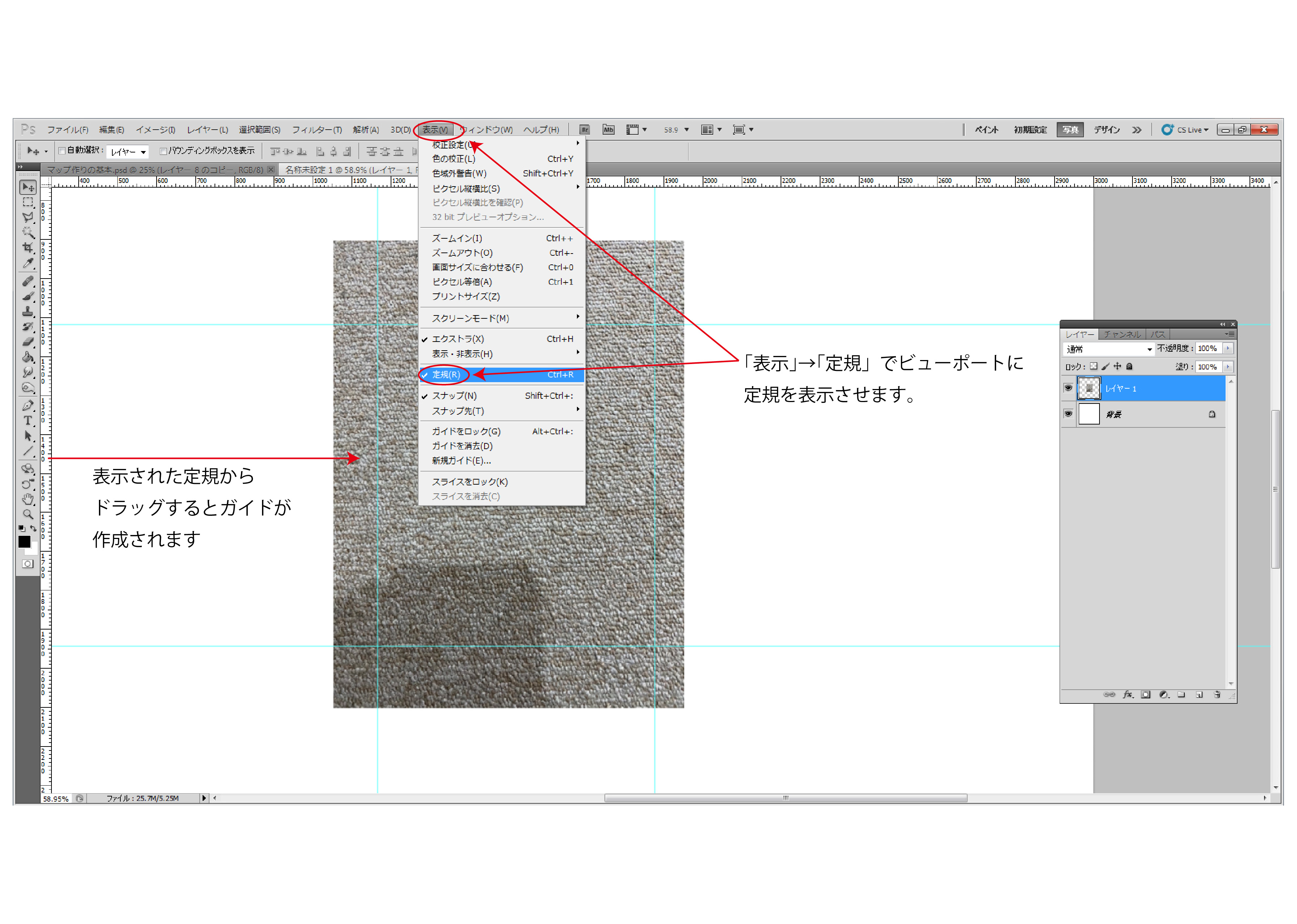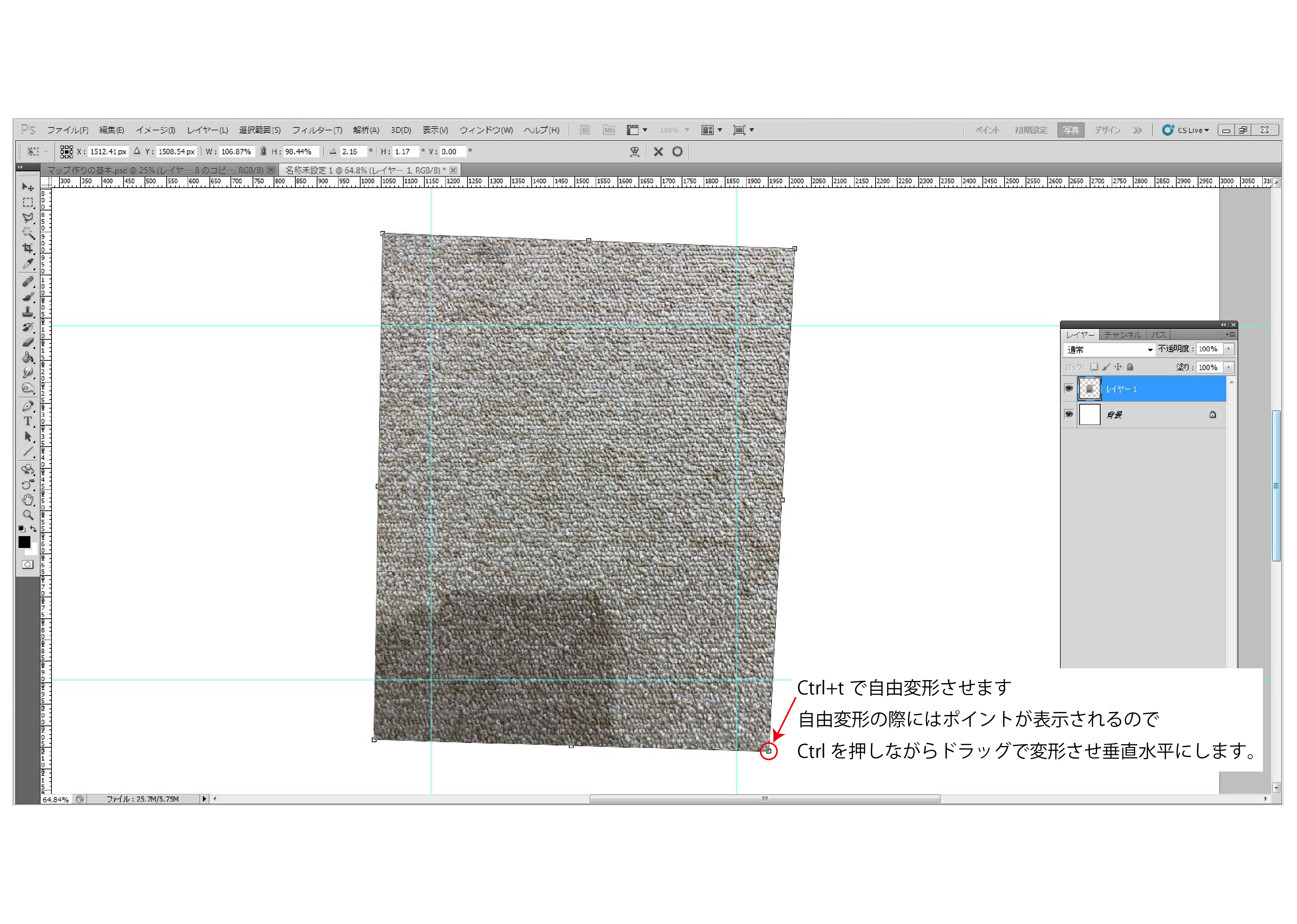 縦横のガイドラインを作成しこの線を見ながら画像をCtrl+tで自由変形させます