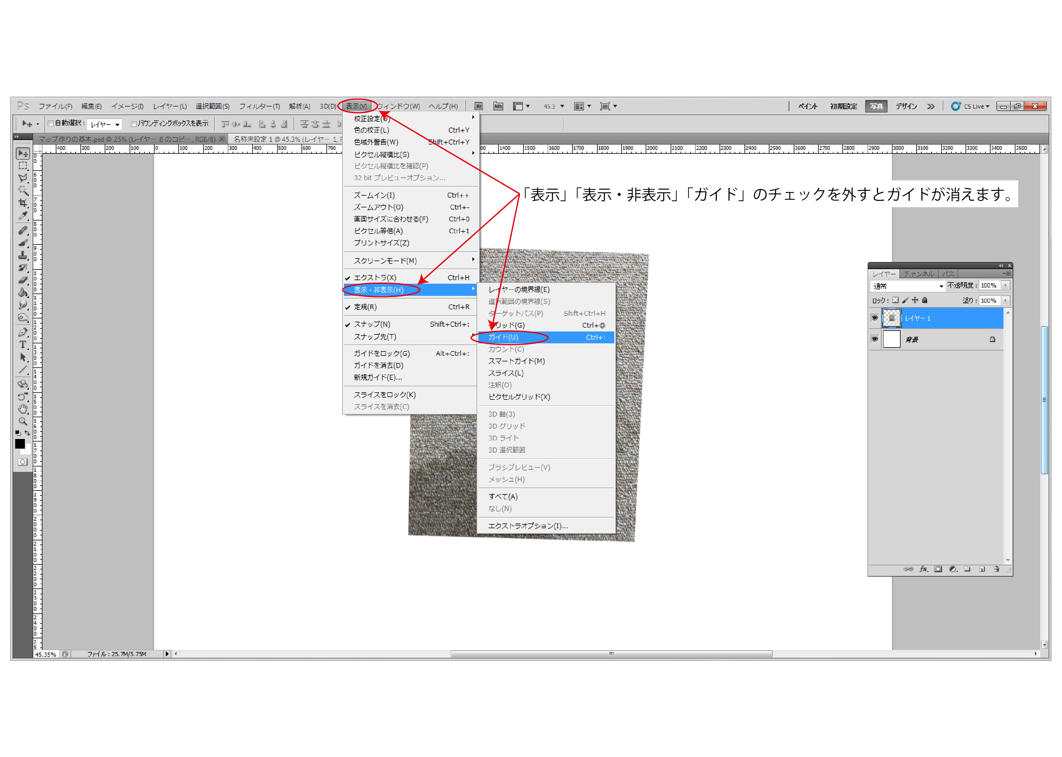 変形後はガイドは不要なので「表示」「表示・非表示」「ガイド」のチェックを外すとガイドが消えます。