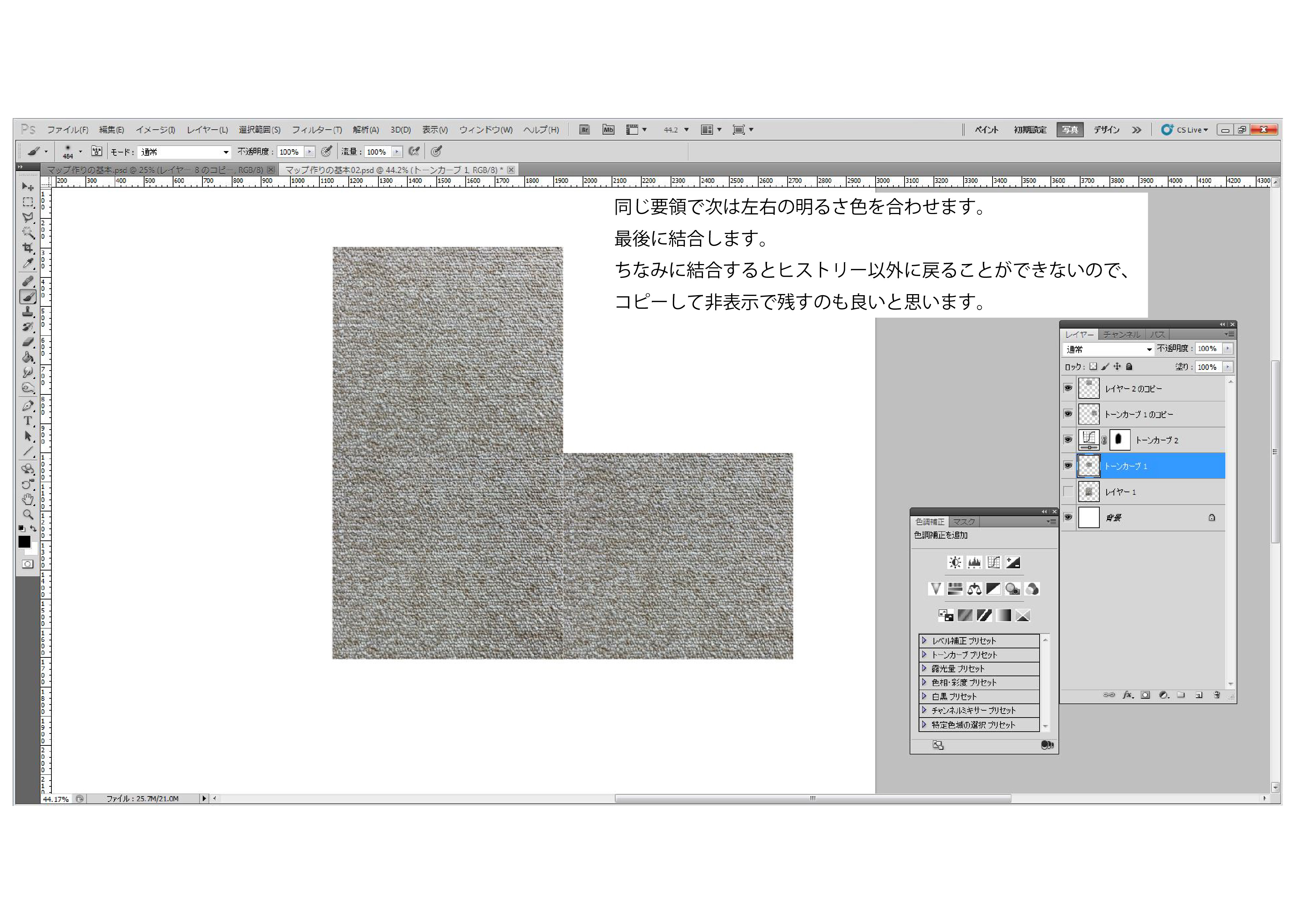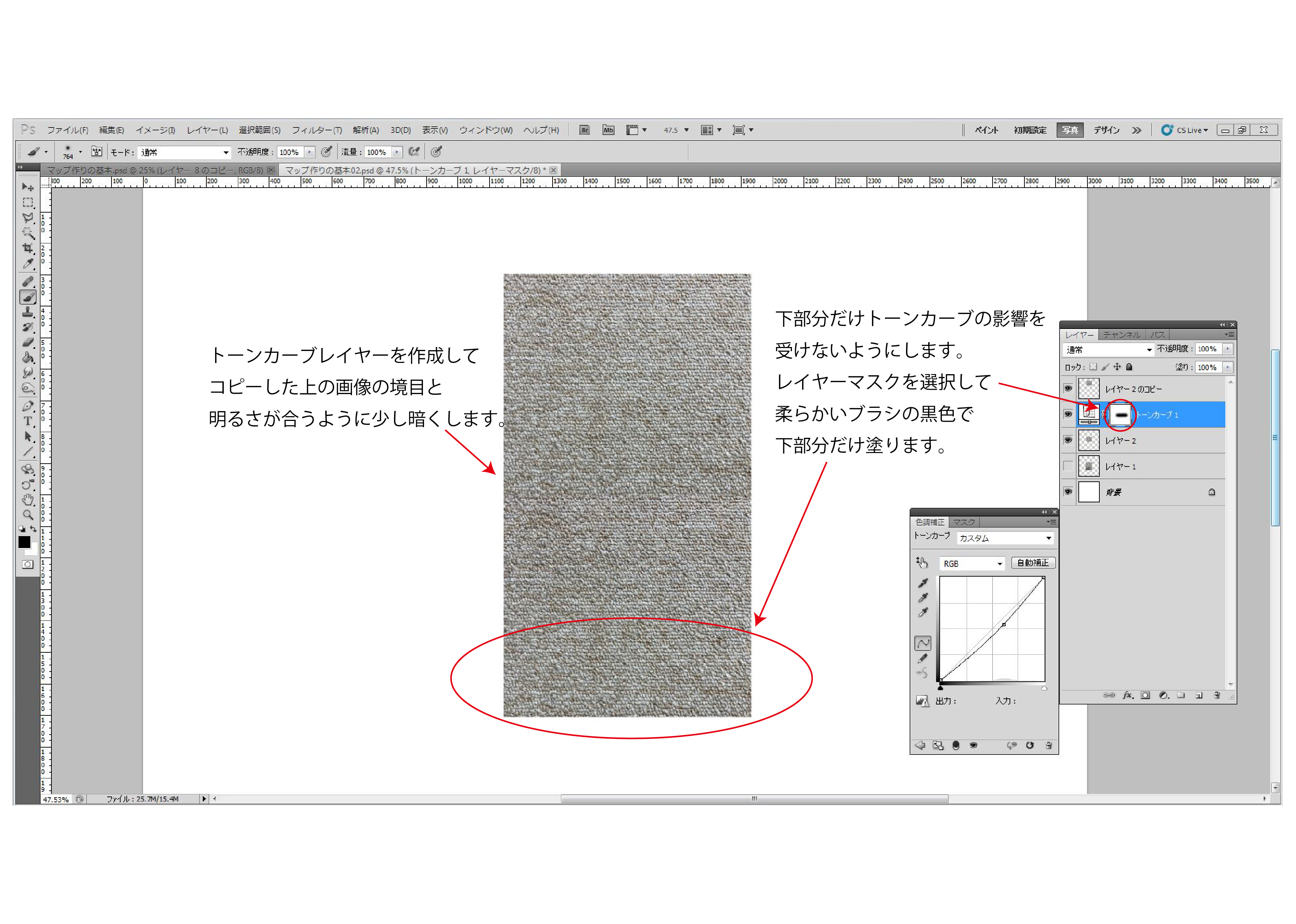 元の画像の上にトーンカーブレイヤーを作成してコピーした上の画像の境目と明るさが合うように少し暗くします。